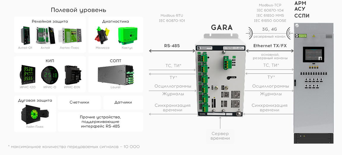 Преобразование протоколов в Modbus-RTU, IEC 60870–101, Modbus-TCP, IEC 60870–104, IEC 61850 MMS, GOOSE